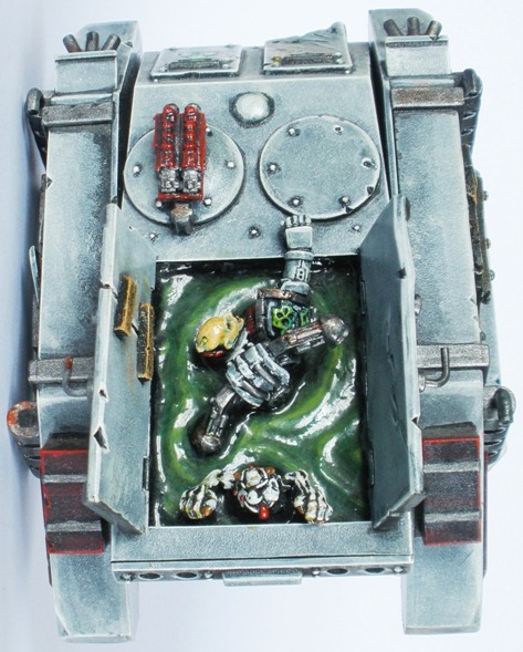 The concept for this vehicle is silly but sort of fun: Nurgle is synonymous with corruption, illness, rot and bodily fluids and so I decided to make the tank look like it is filled with snot. A very adult approach I am sure you will agree.
