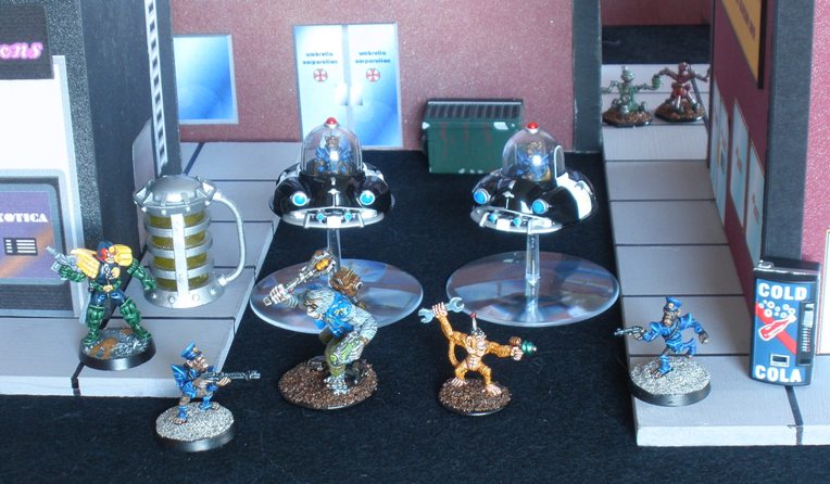 The chimps are Mega Minis with cop hats from Heroclix figures. I had fun painting these guys up. As I still have a few of those space chimp figures I imagine that they may follow suit and form a small force of public servants.