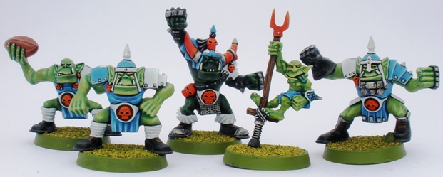 The uniform chosen is particularly un-orky. Thats largely because I wanted to ensure that the figures looked like football players, rather than scruffy Warhammer Fantasy figures. Its still too clean and antiseptic looking though. I would approach painting an orc team very differently these days.