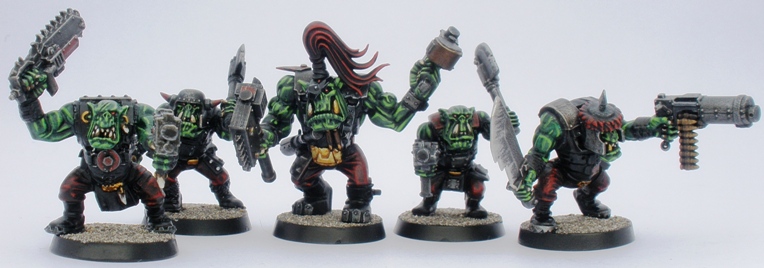 I have recently been painting orks again, primarily for use in a Gorkamorka weekend planned for the summer. I spent a bit of time deciding how to paint this new batch, trying to find a balance between speed and quality that suits me. I also wanted to make sure that the finished figures looked as I imagine them to look: inevitably slightly comical but mostly brutal and savage.