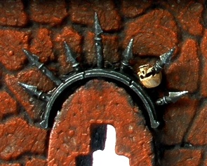 - a lone skull impaled on a spike from a Chaos Space Marine spiky sprue on a piece of the set dressing stuck to the outside of one of the wall sections.