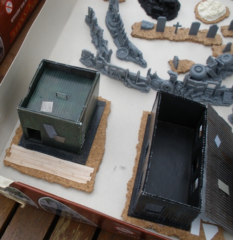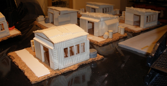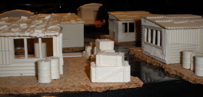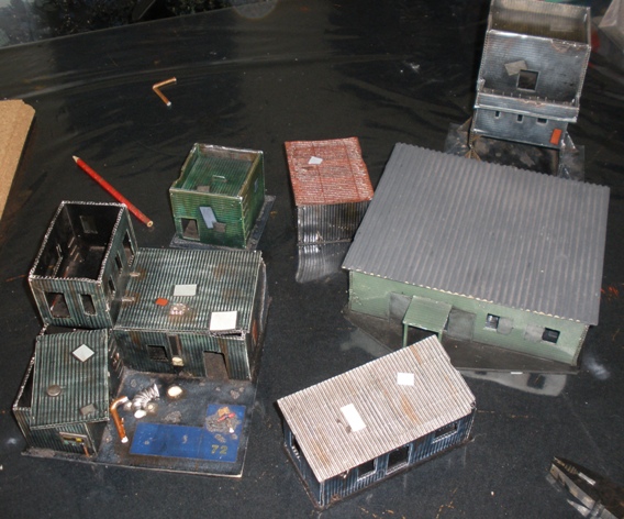 I made five shanty buildings back in 1996 (above). They were largely built from corrugated plastic poster board that I took from a skip on my way home from college.