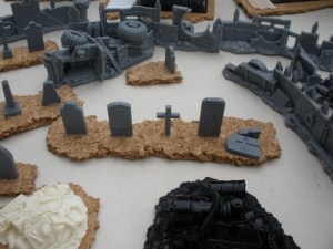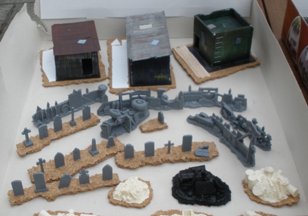 Next I stuck half a set of Renedra plastic gravestones and a set of Pardulon junk piles to cork bases (I hope that the other half of the Renedra gravestone set will eventually be stuck to greener looking bases for use in zombie and Buffy type games). I cleaned up a set of Games Workshop Ork Barricades at this stage too, but figured that they didnt need to be based.