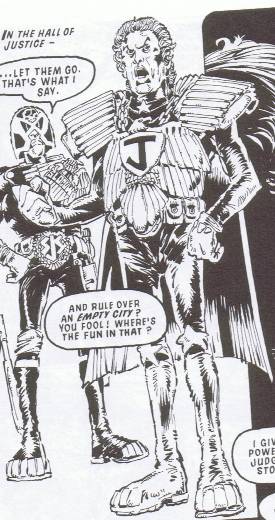 Judge Cal became Chief Judge via questionable means and subsequently reigned over Mega City One for one hundred days in “The Day the Law Died!”. Unsurprisingly, Dredd led the resistance that eventually toppled Cal.