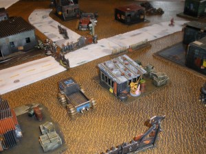 The three forces set up equidistant from a Maguffin (the suspicious looking pink thing on the road in the bottom left of the picture above) and we spent the game converging on that.