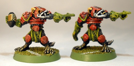 The colour scheme was decided upon for speed of application more than anything else. The chosen uniform colours were applied as a couple of washes over a black through grey to white drybrush. The fleshier tones were layered on in a slightly less down and dirty fashion, but it is very much a “tabletop quality” paint job.