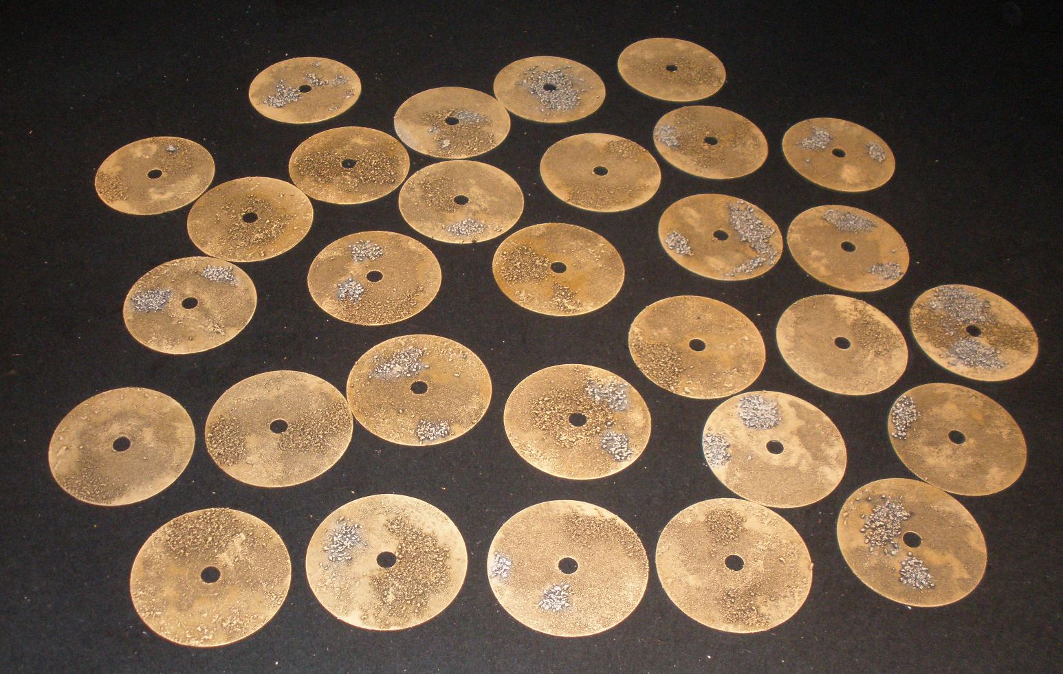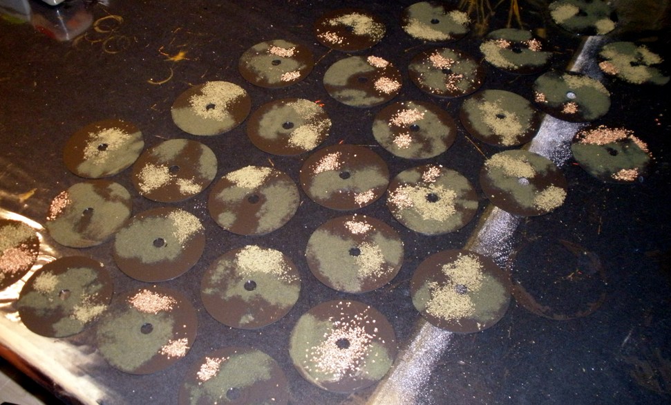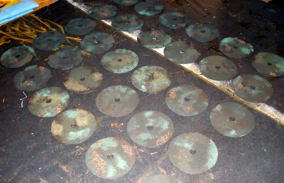 As can be seen by the ugliness of the shiny CDs used in the first days playtesting I needed to make a number of old CDs look a little less shiny and ugly and to try to match them to my Zuzzy mat gaming surface.