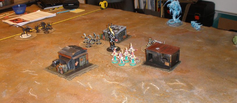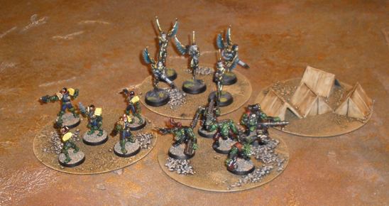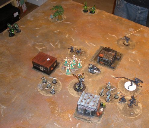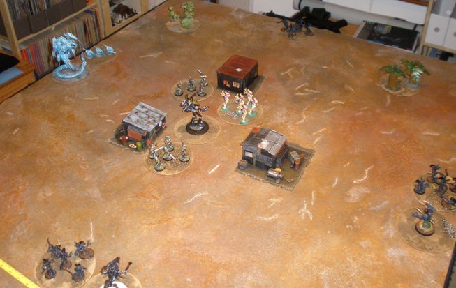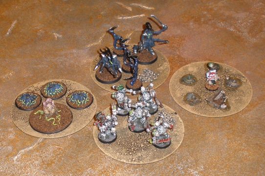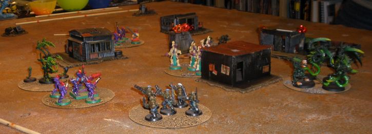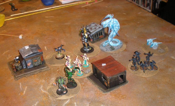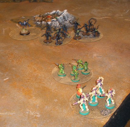 None of us have a suitable painted force of Colonial Marine or Mobile Infantry or even Imperial Guard so a mix of Eldar from both MTs collection and mine performed that role. Space elves have to fumigate their real estate from time to time too I suppose.
