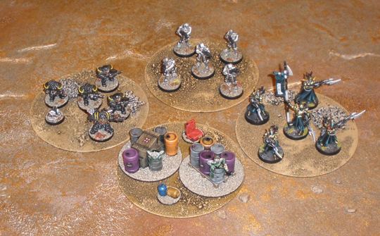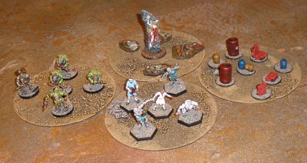 Clockwise from top: skeleton robots, Eldar Guardians, zombie spawn points conveniently located near butane cylinders and gas cans, squat space dwarf forgefathers.
