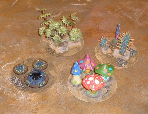 Large terrain pieces that are lovingly modeled onto their bases/CDs are nice to look at but difficult to store and often hard to actually game with. Therefore I tend to make small terrain pieces that I clump together to represent a woods or a ruin or whatever.