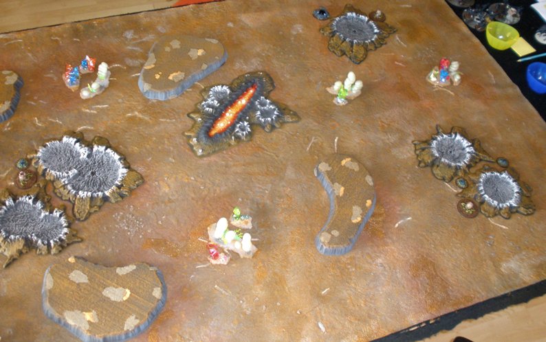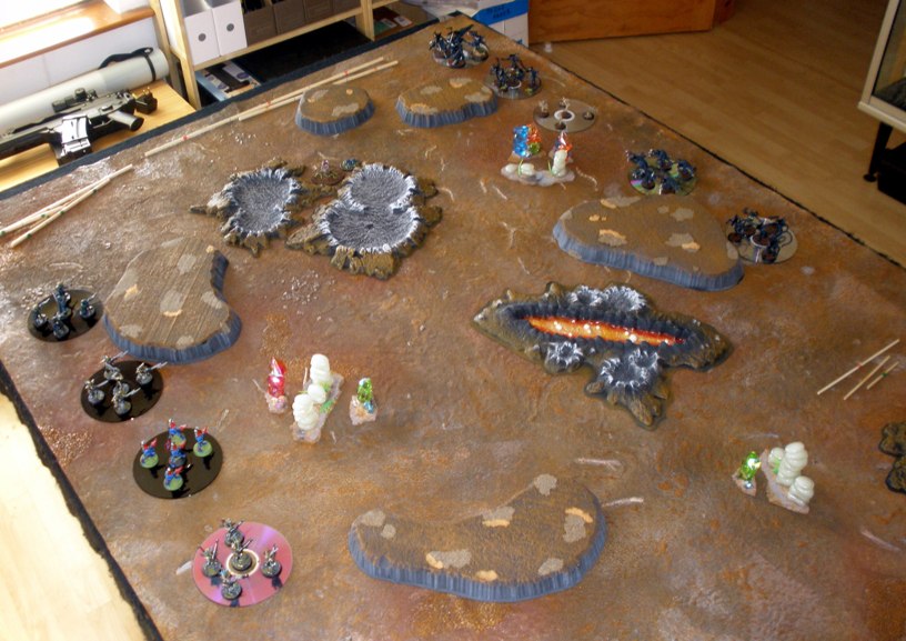One aspect of the rules is that five man/bug squads, objectives, spawn points etc are all arranged on individual CDs for numerous reasons, both in terms of game mechanics and for simplicity when it comes to moving large numbers of figures around. As I only had a little lead up time to this game I didnt get around to texturing the CDs to match the table before the game, so the photos are a bit uglier than usual.