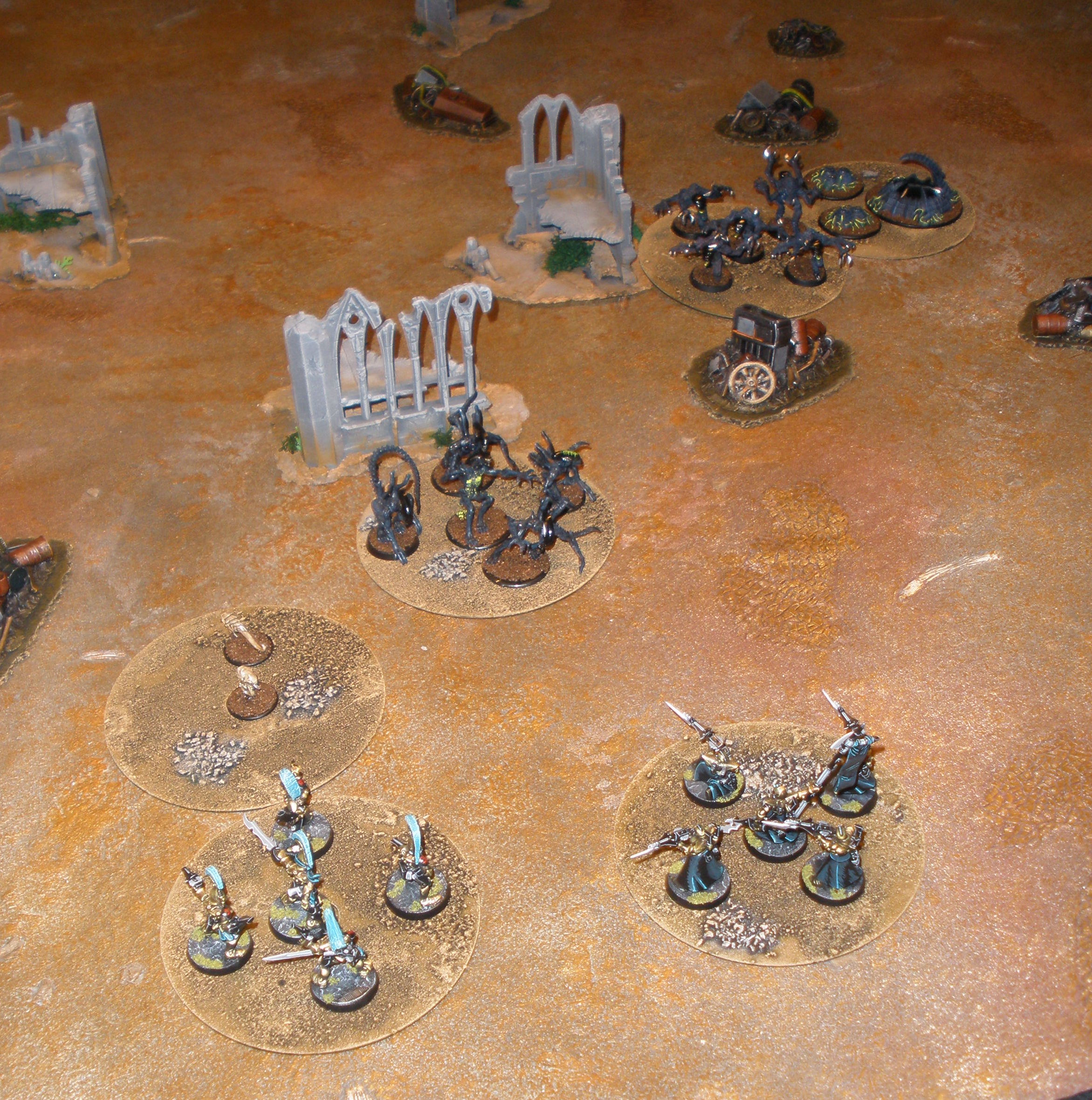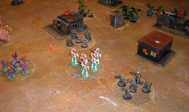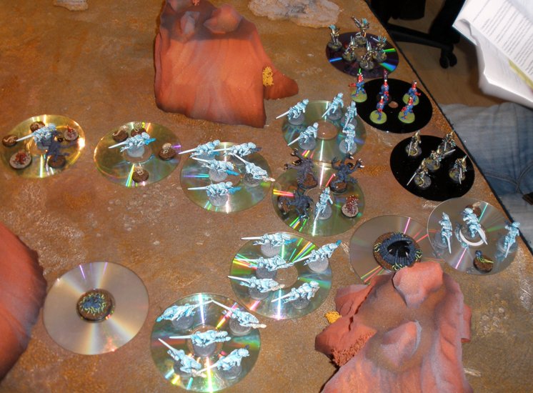 At this point we figured that the marines (the three units on the dark CDs in the photo above) were in trouble. Despite one of the units being comprised of nasty “Power Armour” troops (the Dire Avengers with the retro paint jobs in the middle) we figured that they might not have been able to bring their strengths to bear.