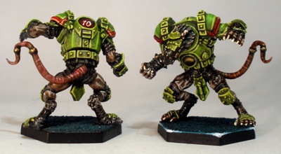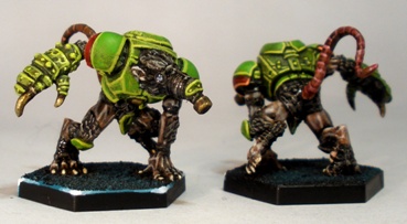 I roughly copied the colour scheme for the ‘killaz from the Warpath veermyn miniatures that I painted last year. That bright yellow/green is fun to paint.