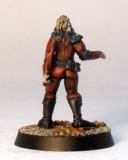 This figure is an Alpha Forge zombie from the Star Mogul game. I bought it from Mega Miniatures when they bought the line. Conceptually the zombie has been rendered dead-alive by some sort of alien process I think, but its a classic guts-hanging-out shambler all the same. I decided to quickly paint the figure in a red outfit just to see if I could make it work (I normally avoid red clothing on zombies because its usually present in gore of some sort).