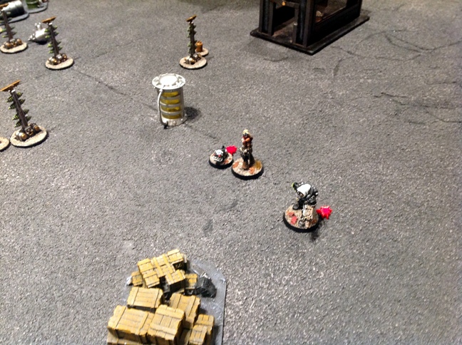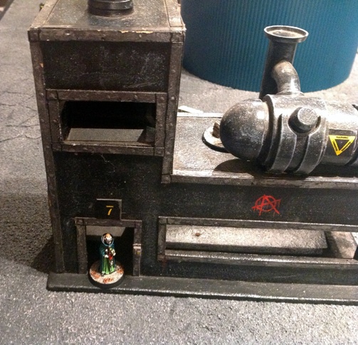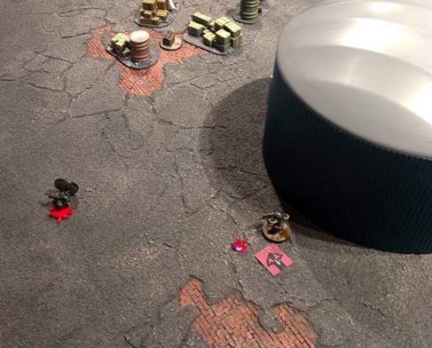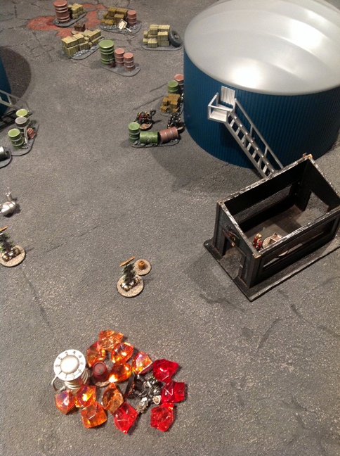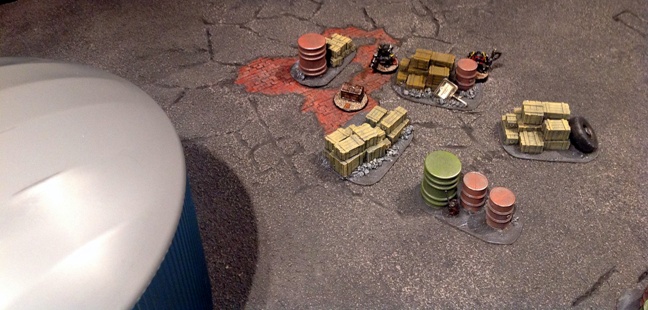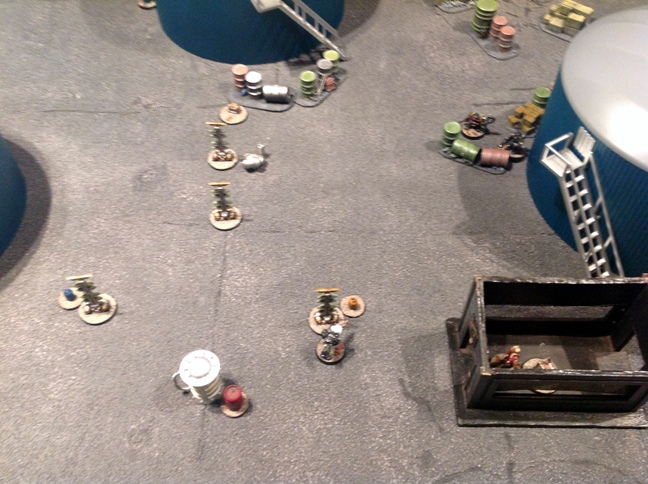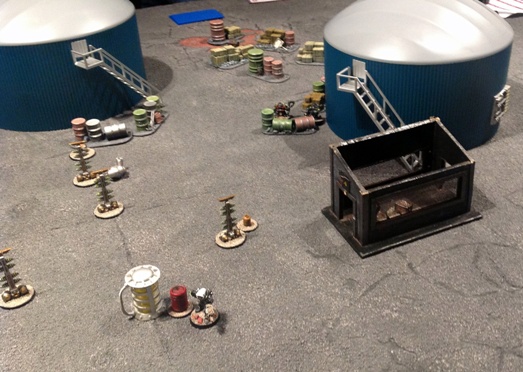 The large, green, silos really need to get a little bit of weathering or other detailing before they hit the table again, but for our purposes they were acceptable as industrial storage scenery. The table remains the least visually attractive of those played over during the campaign though. A few more buildings and vehicles will sort that out at a later stage. Urban sci-fi terrain is going to be a 2014 (2015 maybe?) project but for now, this stuff will do.