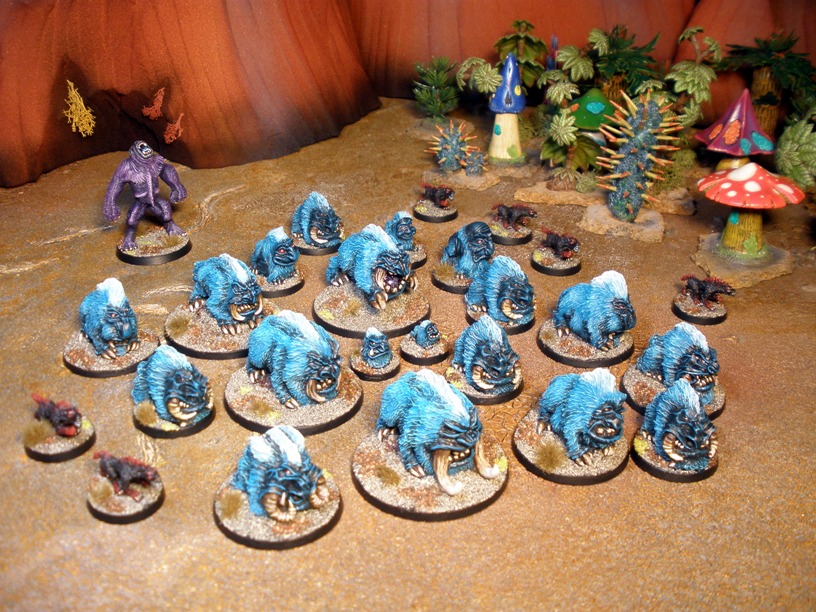 I prefer the more savage looking dunger faces to the goofier humanoid ones, but I included at least one of each of the currently available models in the herd for the sake of painting variety. The slightly more gruff looking dungers also remind me a bit of the pig lizard from Galaxy Quest (although the swine is bipedal).