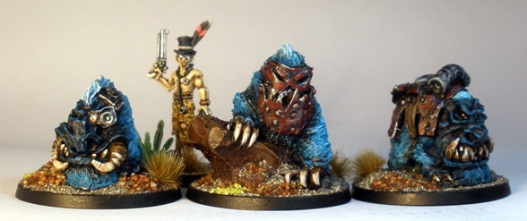 A handful of the dunger models have been domesticated in some way. Why an astro-cow might require a bionic eye or some rough and ready metal fright mask is left to the imagination, but I was glad of the variety when painting. I can justify them as escaped domesticated beasts if I need to, which I dont. The pack-dunger actually suggests a scenario or two to me, being a science-fantasy equivalent of Bill the pony from Lord of the Rings.