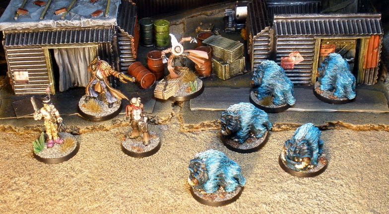 I dont know if you remember, but Riddick kills some guys in a prison while armed only with a mug in “Chronicles”. Although Riddick is shown to be an animal lover in another scene in that prison, I figured that the miniatures called for a classic pantomime “HES BEHIND YOU!!!” photo. I love how chunky that bull dunger model is.