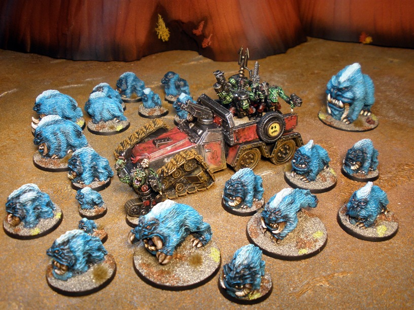 Orks of the BigDogz tribe enjoy a round up, unaware of the angry and territorial alpha dunger in pursuit.