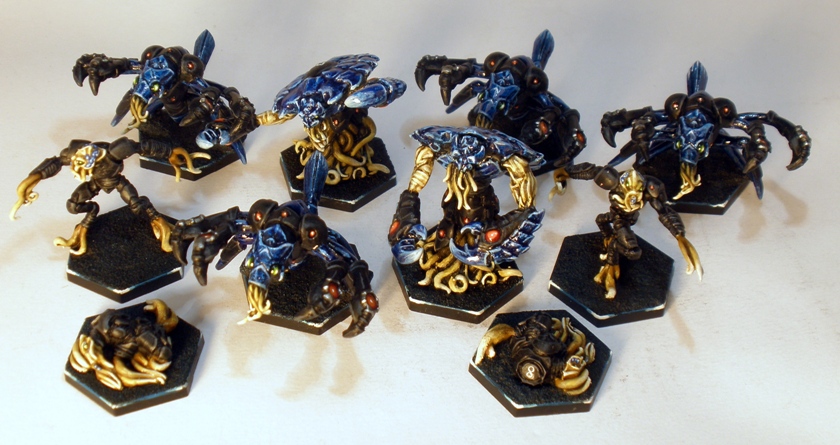 As the colour scheme that I chose for these miniatures is tied to their skin and exo-skeleton tones I had a problem with the squishy and therefore blue-less sticky guards. I painted some blue patterning on their heads to tie them in with the rest of the team and ensure that they didnt look too spartan. I think that it worked, YMMV.