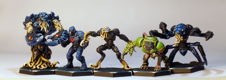 The blue carapace areas on all of the team got a gloss varnish. I dont really know if that makes sense biologically speaking, but I like it. I figure that sentient creatures with shells may well polish and decorate them, caring about their appearance in a similar way to humans getting their hair cut, wearing make up and pulling stray hairs out of their nostrils. Or maybe space tentacle lobsters just have shiny shells.