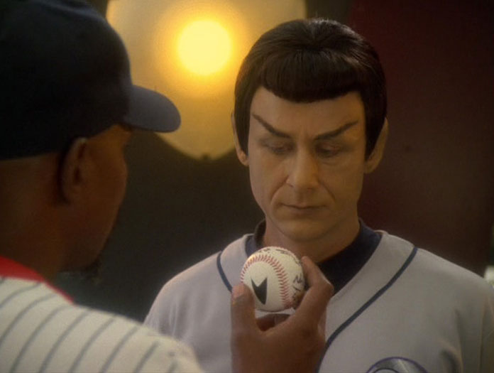 A Vulcan dismisses as “emotional” the possibility of admiring the reflection of his haircut on a polished sphere used in human recreation. He also considers cheating at team sports at some point in the future.