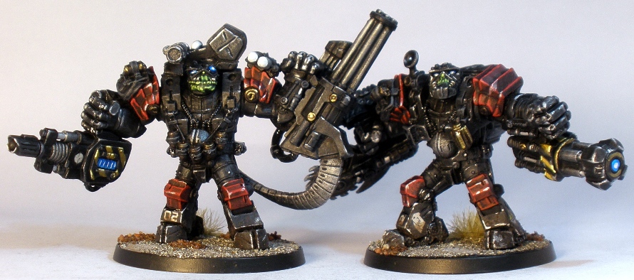I have been painting greenskins over Xmas, with getting a force ready to play Deadzone being the main motivation. The first of these finished are these two heavily armoured “Ripper Suits” and two of the rank and file Commandos.