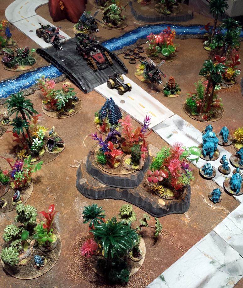 After a few weeks of making a large mess in the man-cave I finally have a 28mm space jungle.
