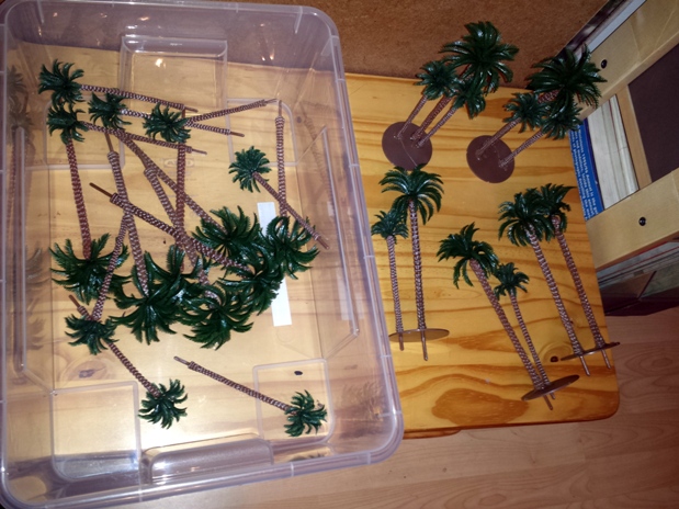 I bought plastic palm trees and aquarium plants on Ebay. I focused on getting as many interesting bright colours as I could, rather than just green.