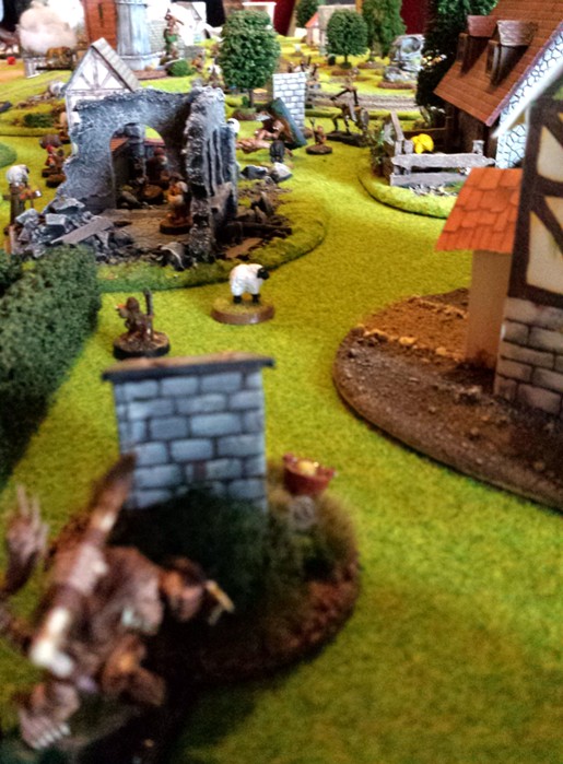 Our rendezvous with Mr Saturday and Just John from the Oldhammer forum at Knavecon worked out well. The planned participation game featured a lot of old school WHFB stuff, with Fimir, Slann and an entire village of hobbits – complete with custom sculpted and home cast halfling scaled miniature sheep thanks to theottovonbismark – and it ran very well, with plenty of players wanting to take part during the day.