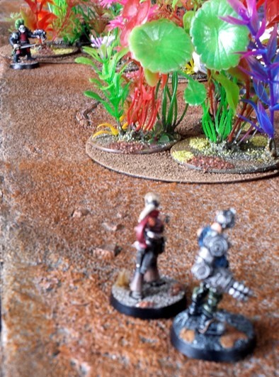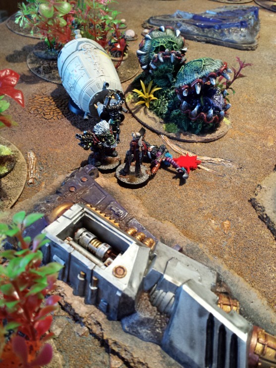 Deja vu kicks in for all concerned as Zodgrod and some gretchin support appear behind Bonos collapsing body, putting some pressure on Rosa. The gunslinger being the centre of attention allows the Astropath and his Feathren colleague to approach the lander wreckage in search of data.