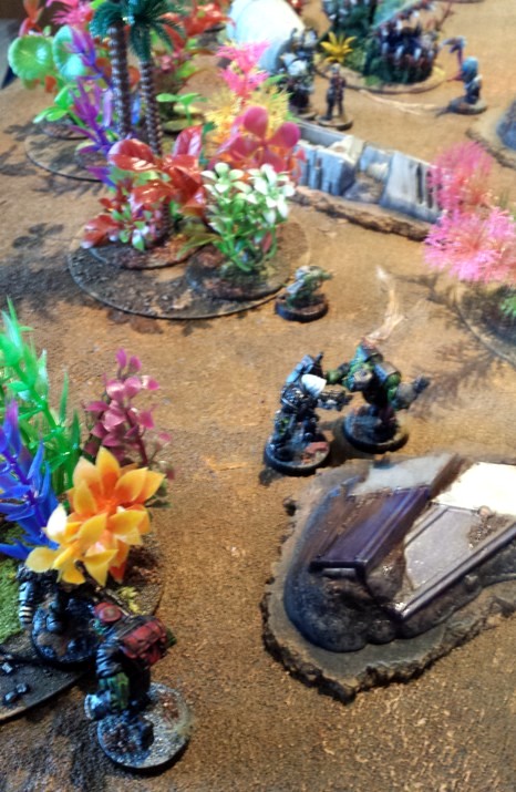 The table wide set up in this scenario led to some interesting match ups, with psychic Astropaths and birdmen assaulting goblin fireteams and lone bionic cadavers holding up entire flanks.