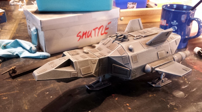 I have a number of other small projects that I am scheduled to complete before I get stuck into my pirate contingent, but I remained in a cosmonautical state of mind over the Easter break. With the opportunity to spend a few uninterrupted hours working on something, I decided to drop every other miniatures project and assemble and paint a small shuttle/lighter/dropship that I bought from Daemonscape a while back (I think that it was originally a GZG kit). I christened it “Shuttle VIII” (unofficially aka “Helga” as scratched onto the hull in three places).