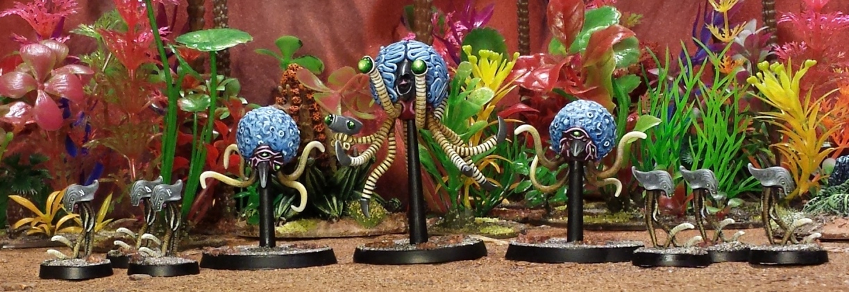 I love that additional flying brain monster. Who ever would have thought that there would be so many different miniatures of flying brains available for the connoisseur? Your excellent colour scheme keeps them as a coherent force (in case they come up against another gang of disembodied floating brains).