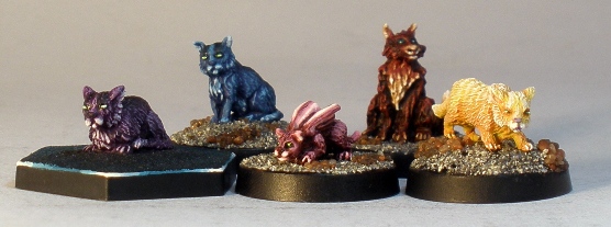 I enjoy painting luridly coloured little cat models, so this model fits right in with the rest of my stuff. Frisker is significantly smaller than most of my 28mm cats. Friskers is far more realistically scaled than the others really, if that sort of thing bothers you.