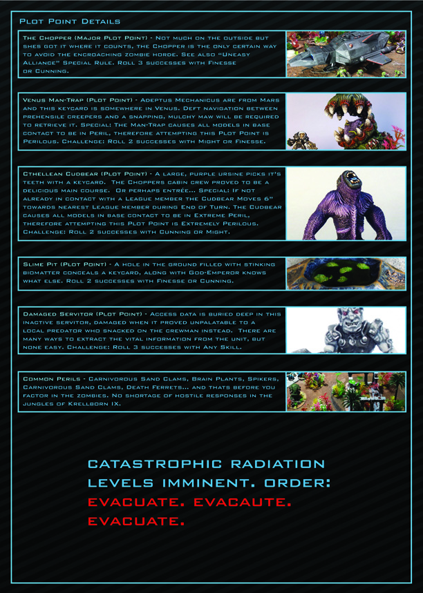 Uncanny radiation from perilium deposits exposed by recent seismic activity (see “Inquisitor – The Ragna Rock” for details) has caused the dead of the Northern Polar continent of Krellborn IX to rise and attack the living. Being suddenly surrounded by homicidal cadavers has brought the individual agendas of the various factions currently in the area to an abrupt end. Escape is the only thing on our heroes minds and the only reliable route out is by air.