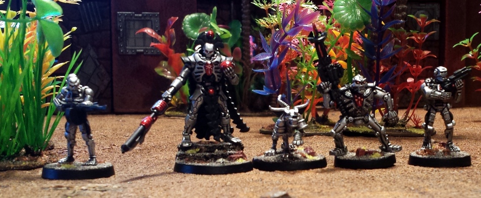 L to R: Necron Warrior Mark 1, Cyber-Shogun Hector Decimal, Canoptek Cyber Canine Tob-E, Viscount Finlux, Necron Warrior Mark 2