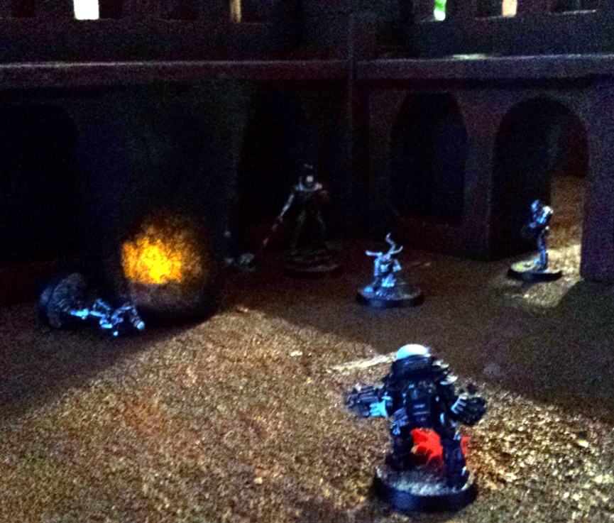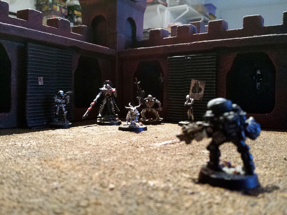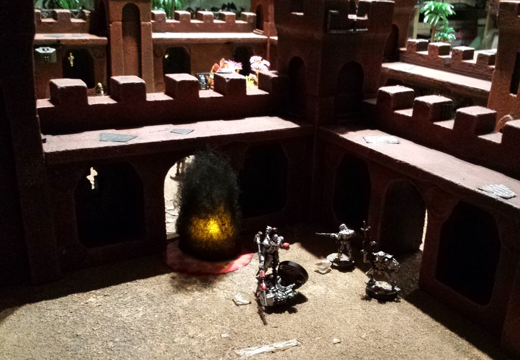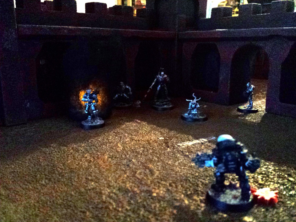 The battlefield is an old shanty filled fortification that has changed owners and functions many times throughout the millennia. It may be that the ruins were originally built on this location as part of a failed plan to harness the strange energy sources from below. Inquisitor Verhoeven can be seen on the bottom right of the image, trapped by the Necron force.