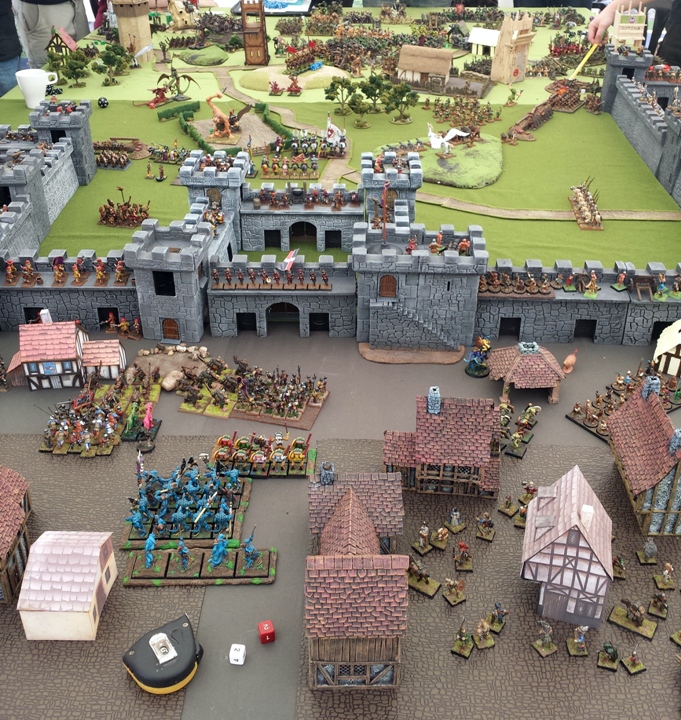 We arrived at 1630ish on Friday, technically early for the event and expected to find very few people in attendance. We didnt expect to find the massive Warhammer siege game in already in progress with ~15 players standing around a 6 x 12′ table covered in miniatures. I dont play many fantasy games – sci-fi is more my thing – but a game of this size has a lot of appeal all the same. I havent seen a game of that size in person before and unless the guys run the same thing again at a future event, I doubt I will again either.