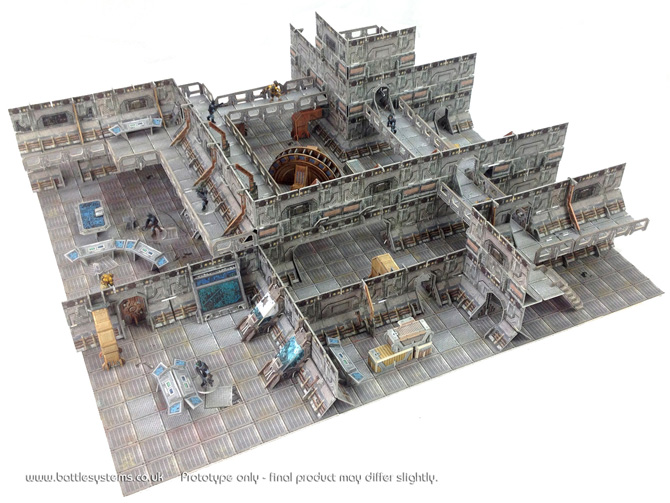 To date I have tended to avoid card terrain for my miniatures games – I prefer the more traditional, modular “train set” terrain sort of approach and mixing the two can be difficult to get right. Storage and time considerations had me resigned to my toy soldier interactions taking place in outdoor settings (a detailed sci-interior space is a huge commitment of resources) but then this Kickstarter came along and provided a one stop shop to fix it.