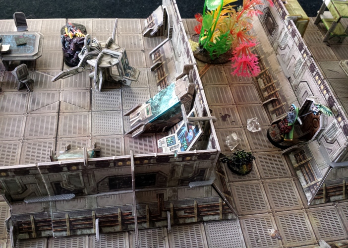 Another rip-roaring, sci-fi game of Pulp Alley today, this time featuring the debonair, quip-cracking, buckle-swashing Archduke Ramirez Connery Bond and his adventuring companions versus the nefarious, drug-fueled mercenary forces of the Purgators. It was also a great opportunity to get my first game in with my new Battle Systems interior terrain.