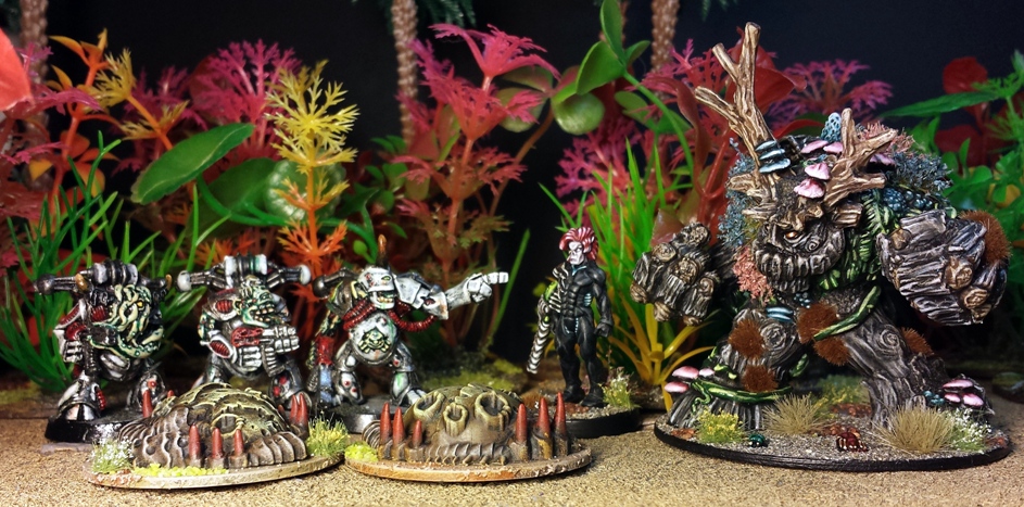 The bark was painted in a similar way to most of the areas on the Reaper bones Familiar “Stumpy” that I painted last year. The foliage on Char’lee was painted to match the green areas on Stumpy and L’Oreal (the space elf model that is a primary influence on this project). The fungus on the model is painted in two different colours, also matching elements of L’Oreals palette, which in turn tie in reasonably well with my jungle terrain.