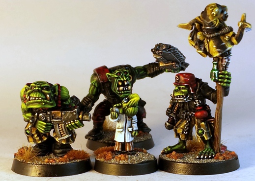 The clearing of half finished models from the painting desk before the close of 2014 continues. Treading the line between Dr. Bunsen Honeydew and some mogwai fed after midnight are these Brainboyz, ready to lead ork armies into a more intellectual era.