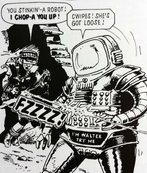 Walter fell out of favour as the Dredd strip became grittier in the nineties, right up to having the poor little guy smashed to pieces by Mean Machine Angels head. As is often the case with things like this, Walter was reintroduced later having been rebranded as “post modern” rather than “rubbish”.