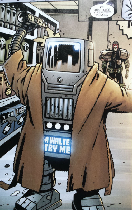 Walter the Wobot is a comic relief character who has irregularly featured in the Dredd strip since prog #10 back in 1977. A vending machine/klutz with a “speech” impediment played for laughs, Walter was nonetheless integral to a number of significant Dredd stories.