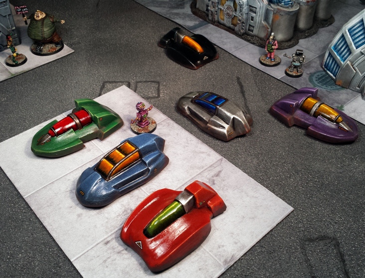 The vehicle models shown here come from several sources. The long, art deco style vehicles shown above are “Marx Cars of the Future”. I picked them up on Ebay back in 2011 or so I think. They are apparently retooled models of kids toys from the 1950s, which explains the really rather lovely retro-futuristic styling.