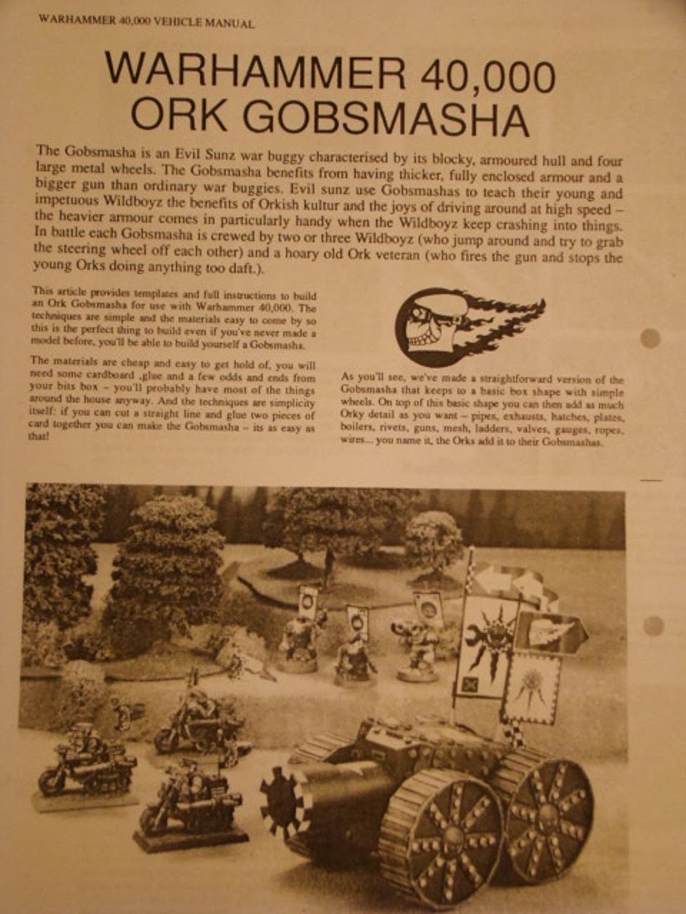 The original Gobsmasha was defined in White Dwarf #136 back in the early 1990s. It was a box shape made from card, a barrel made from a Smarties tube plus paint pot, a couple of spares from a Rhino kit and four coffee jar lids. I tried to make one back then, but the vast increase in household coffee intake required to complete the vehicle meant that my version of that model never got completed.