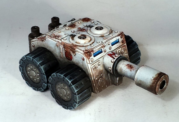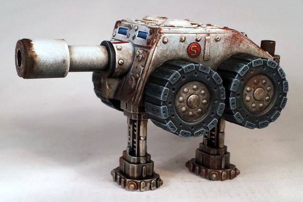 The jump jacks were made from pieces from the Mantic Battlezones terrain kits. The parts were assembled unmodified other than magnetising the top to match with corresponding magnets in the underneath of the vehicle, so that the jump jacks can be added or removed as required, like a toy.