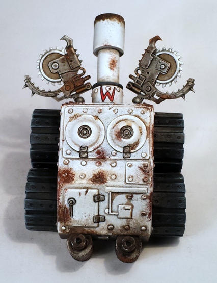 EDIT: The Mark 5 does have a few gadgets that I didnt include for various reasons. The periscope nearly made the cut but I didnt bother in the end, I regret that slightly, but I wont be drilling into a painted model. The bulletproof canopy could have been represented by some popup armour or something but it seemed redundant when the Mork 5 is sealed anyway. I figured that the wheels on the Gobsmasha were distinctive enough as is without modification and the one area that might have been useful to denote as headlights ended up being the hard points for the saws. That said, I may add a bird-drone at a later date: it appeals for a few reasons.