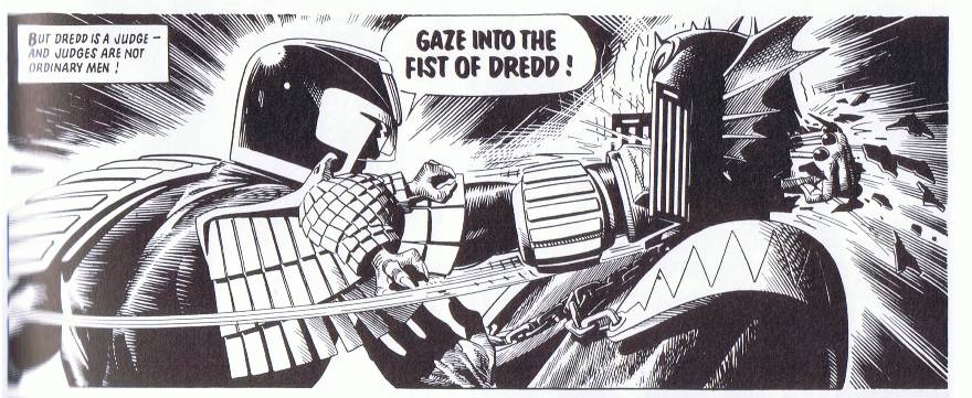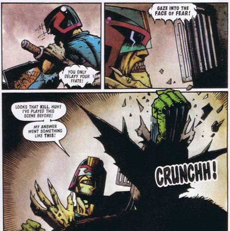 That pattern has become something of a theme. Judge Dredd + Judge Fear = Fears head gets mangled/severed/mashed. I never understood why in these cases Judge Fears helmet appears to have the durability of a damp Digestive biscuit, but who cares.